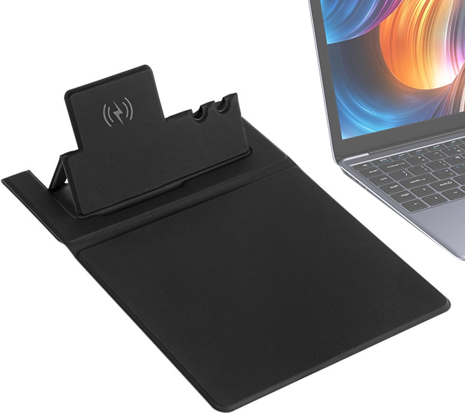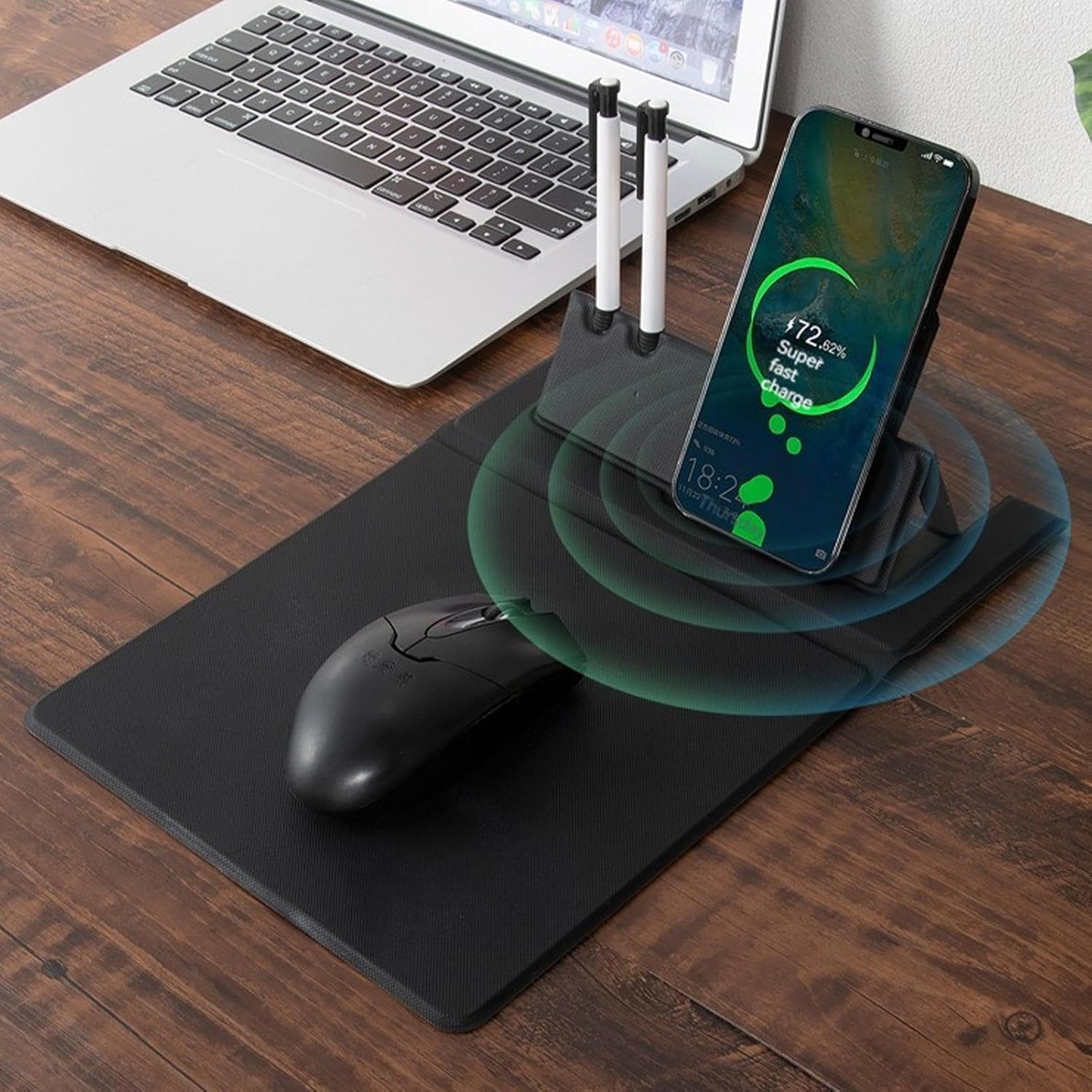 Letar du efter ett smart sätt att få ordning på skrivbordet och samtidigt slippa krångliga sladdar? Denna musmatta kombinerar flera praktiska funktioner i ett – en trådlös laddare inbyggd i ytan, en stadig mobilhållare och en praktisk pennhållare. Allt i ett lätt och kompakt format som dessutom kan fällas ihop och tas med överallt.