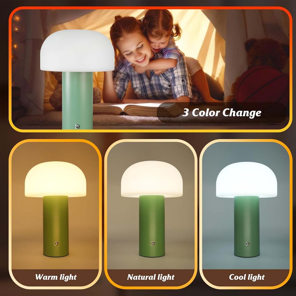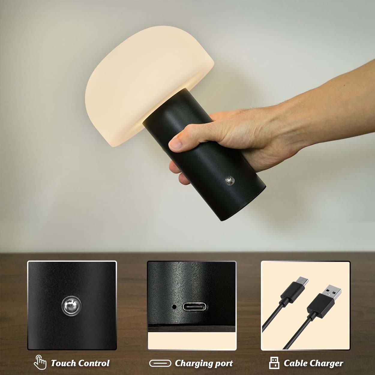 Denna charmiga nattlampa i form av en svamp ger ett mjukt och varmt sken som skapar en mysig atmosfär i sovrummet eller på skrivbordet. Perfekt för både barnrum och vuxna som vill ha en behaglig belysning under natten utan att det blir för starkt. Lampan är trådlös och kan enkelt styras med en touchknapp, vilket gör den smidig att använda överallt. Med en laddning på 2-4 timmar kan lampan lysa kontinuerligt i 8-10 timmar, vilket gör den idealisk för både inomhus- och utomhusbruk.
