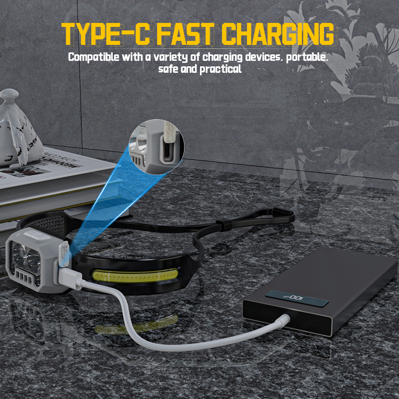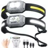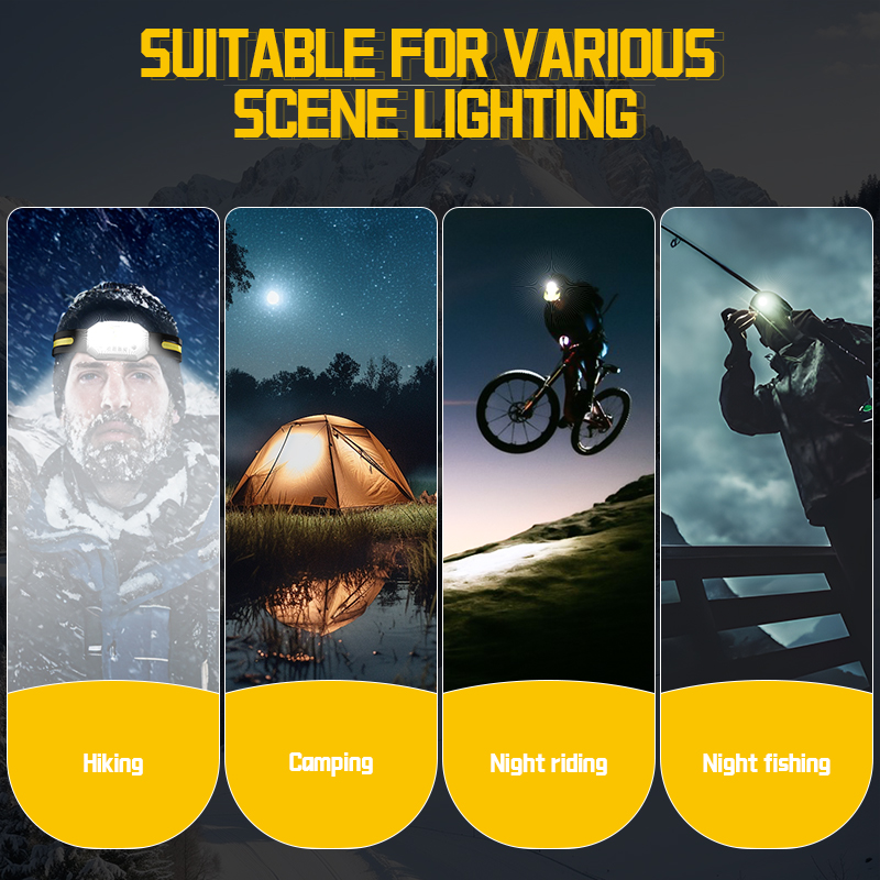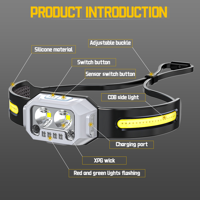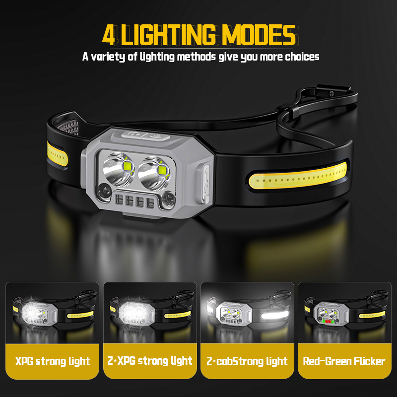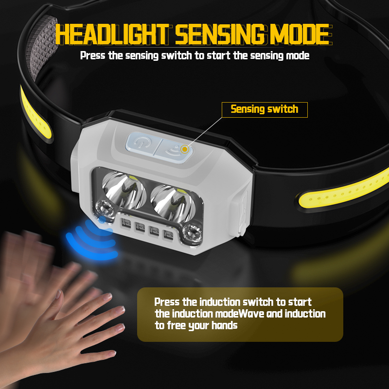 Denna pannlampa är perfekt för alla som behöver starkt, pålitligt ljus vid camping, löpning, fiske eller vandring. Med en smart rörelsesensor kan du tända och släcka lampan genom att bara vifta med handen nära lampan, vilket är smidigt när händerna är smutsiga eller upptagna. Lampan har fyra olika ljuslägen: starkt vitt ljus, svagare vitt ljus, bred COB-ljusfält och röd/grön blinkande lampa för olika användningsområden.