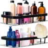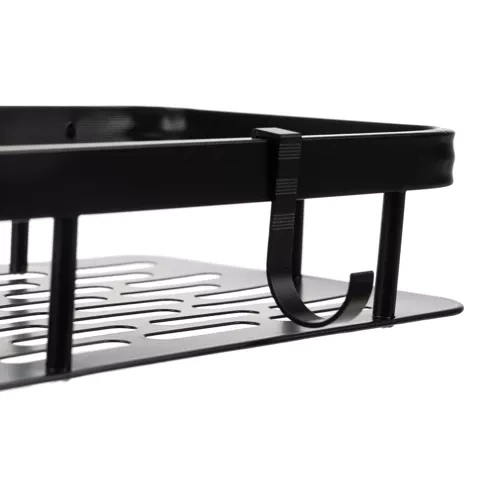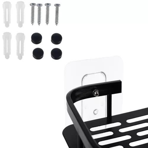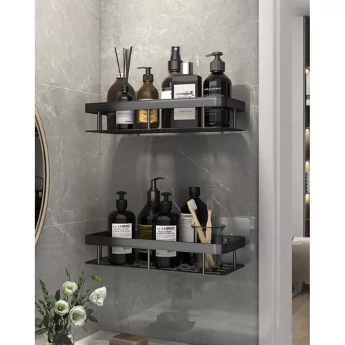 2-pack Badrumshylla med krokar – Självhäftande eller skruvmontering, rostfri och hållbar design, Svart Aluminium