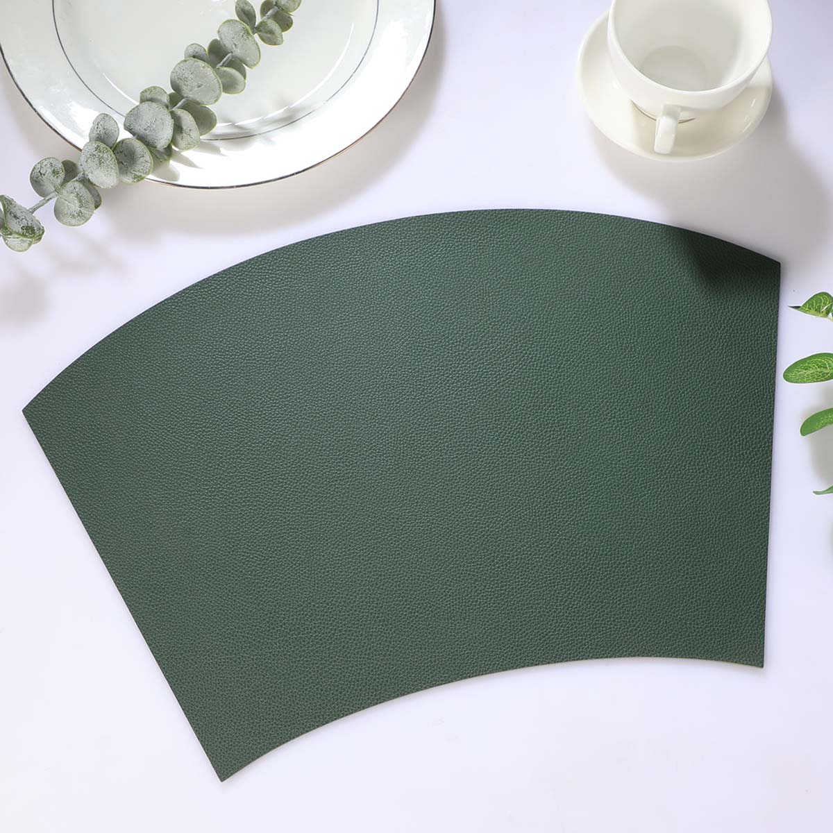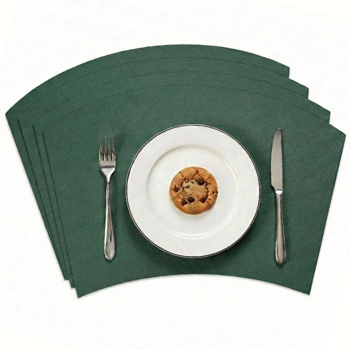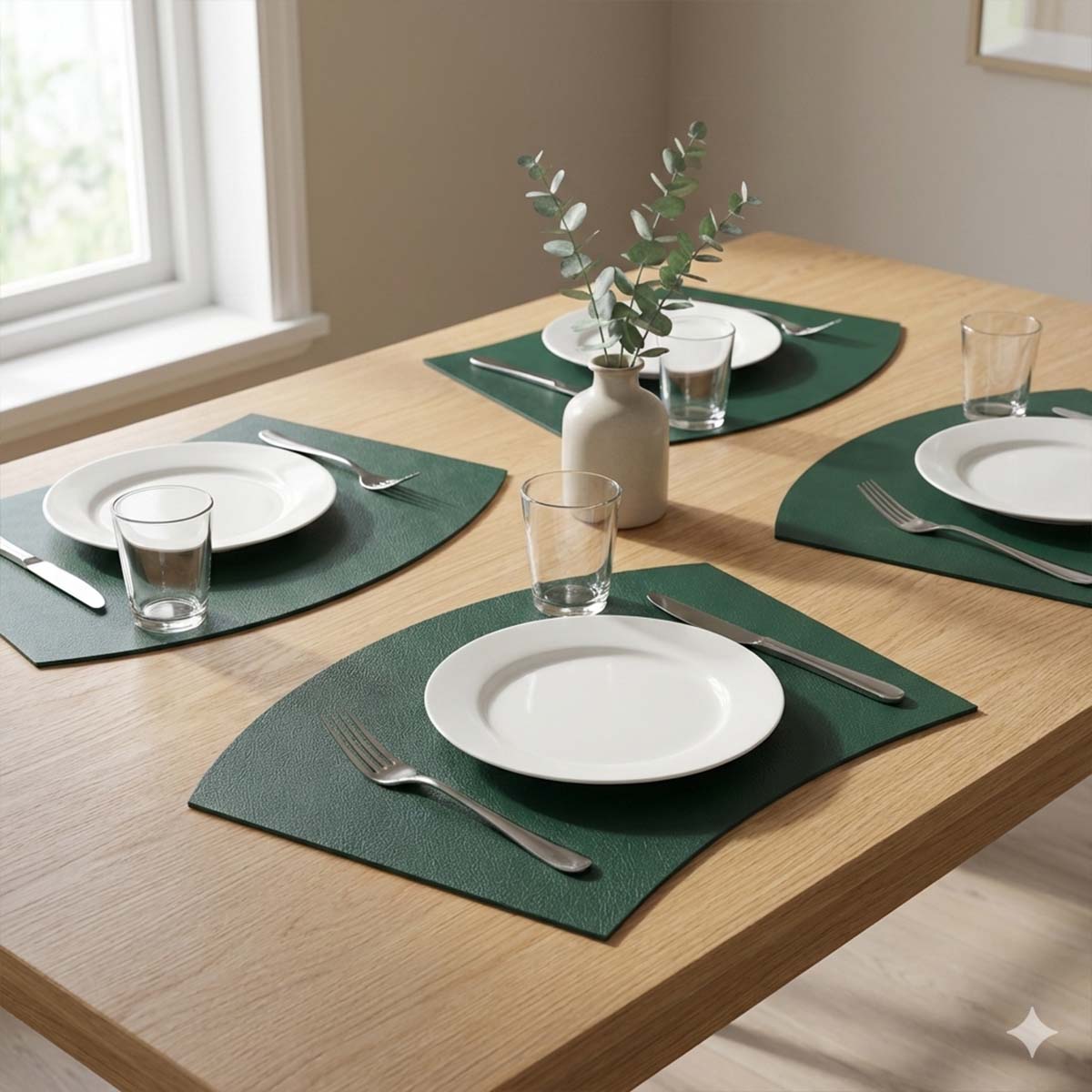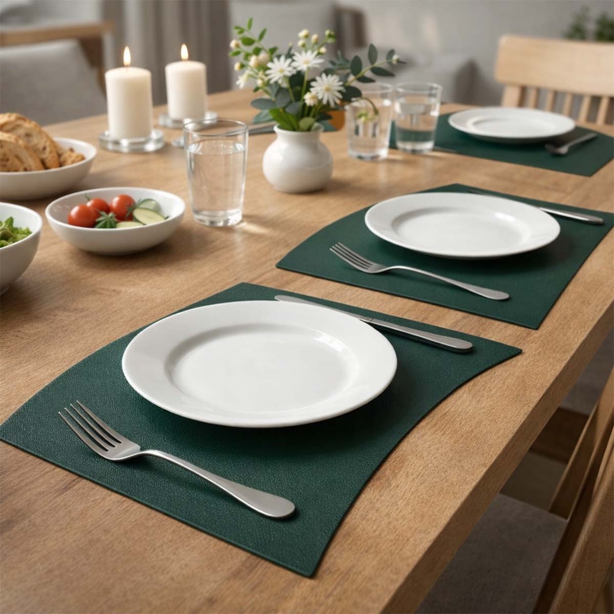 Snyggt och praktiskt 4-pack bordsunderlägg i mörkgrönt konstläder med en unik välvd form. Dessa avtorkningsbara tallriksunderlägg skyddar effektivt ditt bord mot spill och värme samtidigt som de ger en lyxig touch till dukningen.