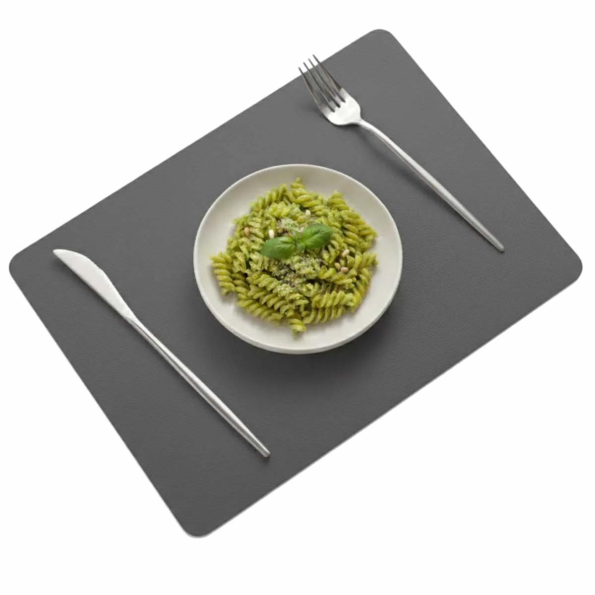 Klassiska och eleganta rektangulära bordsunderlägg i mörkgrått konstläder. Detta 4-pack ger ett effektivt skydd mot repor och spill samtidigt som den tidlösa designen lyfter din dukning till en ny nivå av stil och enkelhet.