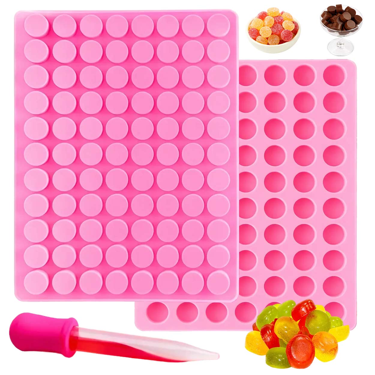 Vill du göra eget godis hemma på ett enkelt och smidigt sätt? Denna silikonform med 88 runda håligheter gör det lätt att tillverka gelégodis, chokladpraliner, vingummi eller små dekorativa detaljer till bakverk. Med den medföljande pipetten fyller du snabbt och exakt varje hålighet utan spill – perfekt när du arbetar med flytande choklad, gelé eller sockerlag.