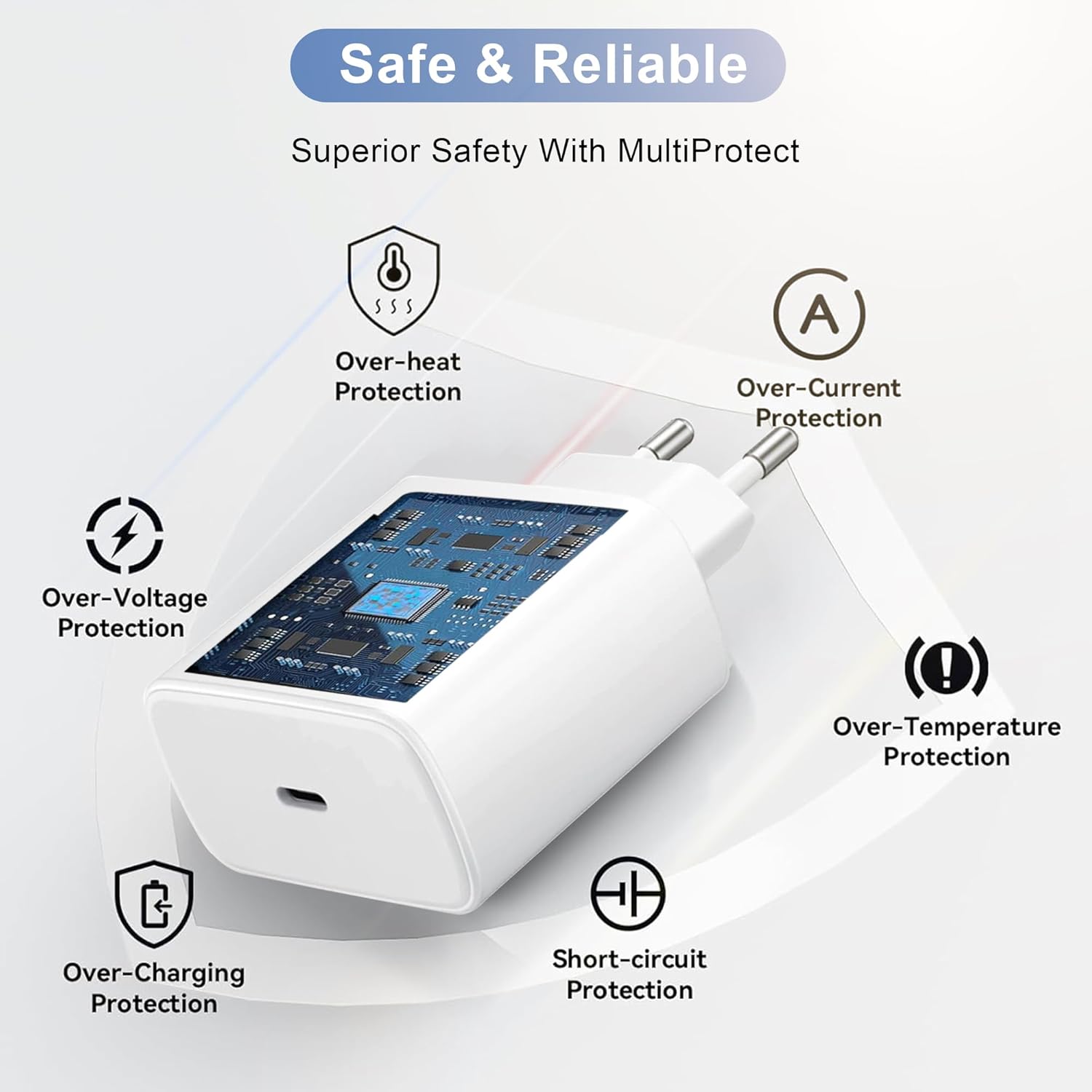 Den smarta inbyggda IC-teknologin skyddar mot överhettning, kortslutning och överladdning, vilket gör att din enhet laddas säkert och effektivt. Laddaren är dessutom lätt och kompakt, perfekt att ta med sig på resan eller ha hemma. Kabeln på 1 meter är robust och ger frihet att använda mobilen bekvämt medan den laddas.