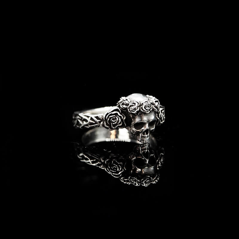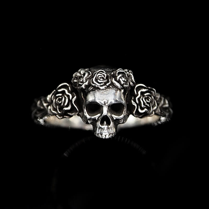 Denna ring kombinerar en detaljrik dödskalle med eleganta rosor för en look som är både rebellisk och vacker. Perfekt för dig som vill ha något annorlunda.