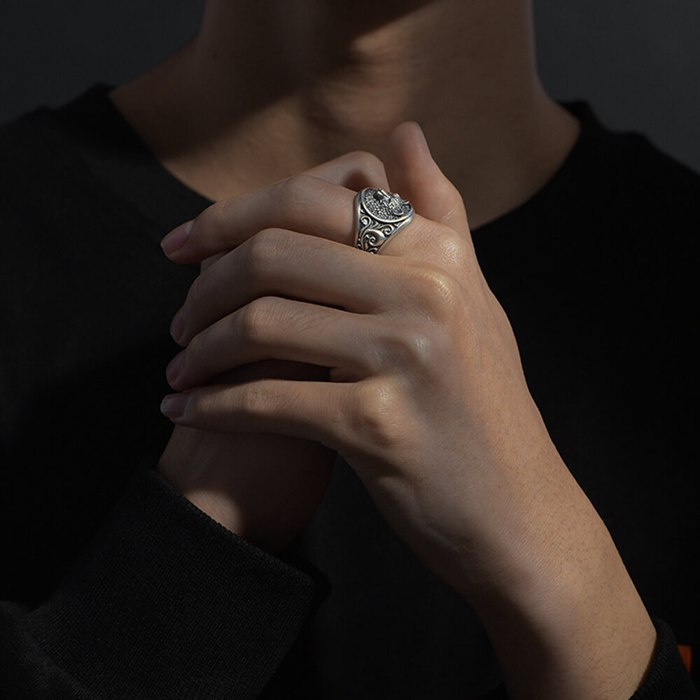 Varghuvudet är noggrant utformat för att symbolisera styrka och mod. Denna ring är inte bara ett smycke, utan också ett kraftfullt statement.