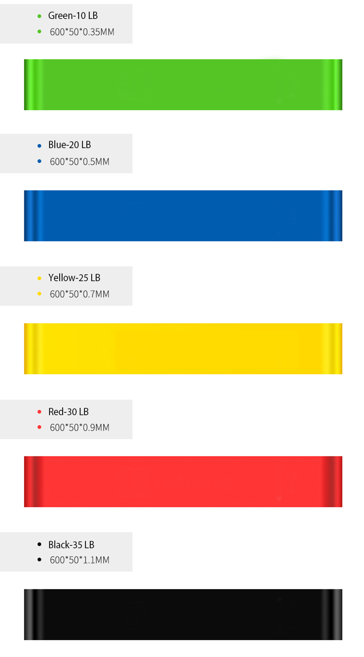 Få ett komplett träningspass hemma med detta set med 5 träningsband i olika motståndsnivåer. Perfekt för styrketräning, uppvärmning, rehab, yoga, pilates och funktionell träning.