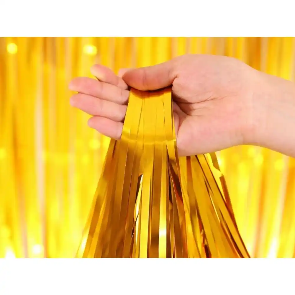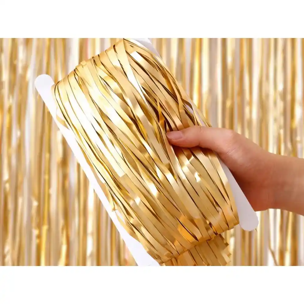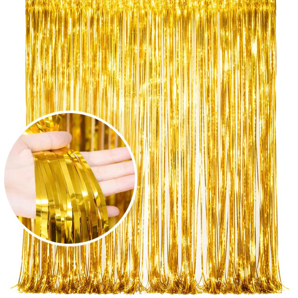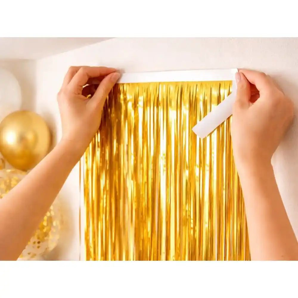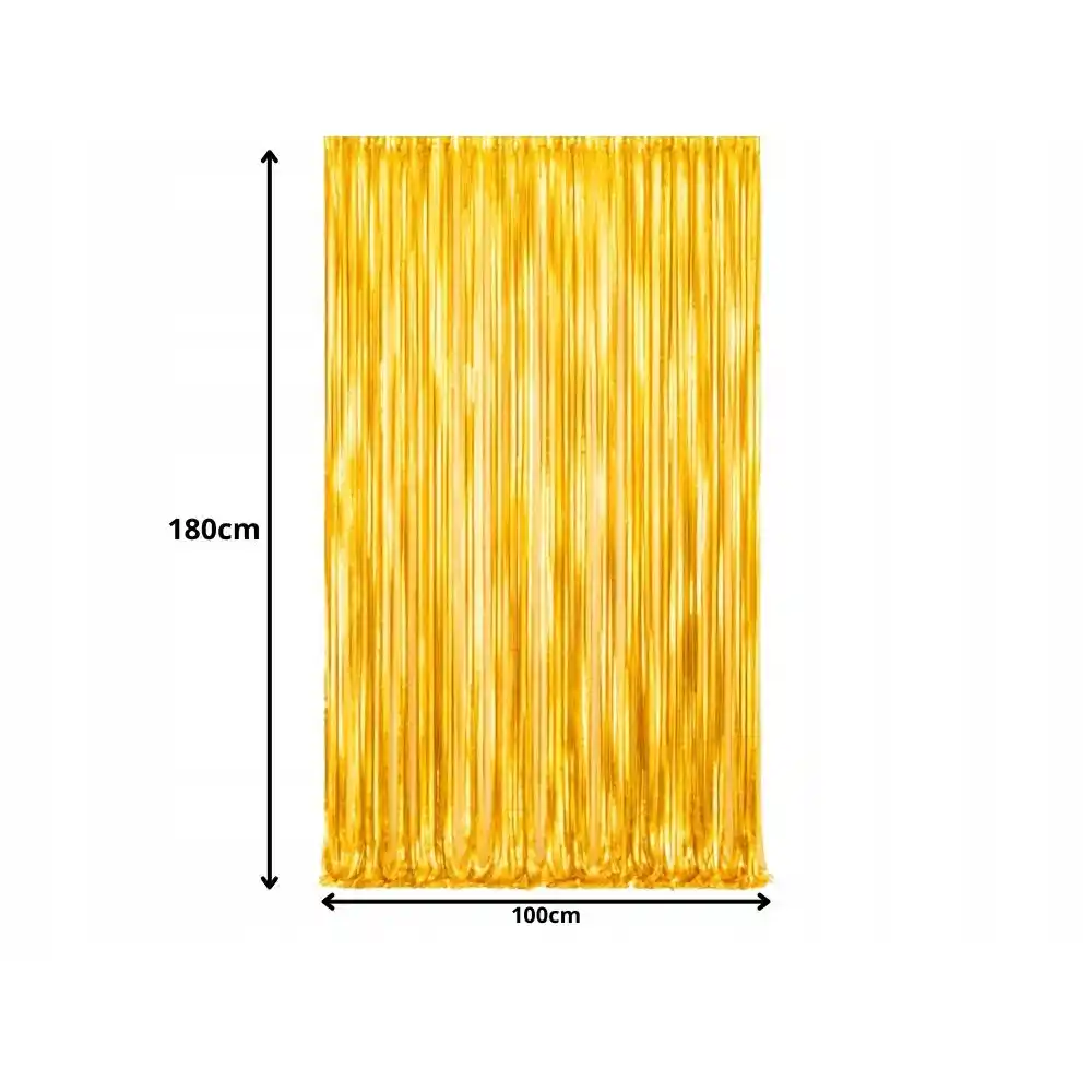 Denna guldfärgade foliegardin är en enkel och effektfull dekoration som skapar en festlig och lyxig känsla på några sekunder. Perfekt som bakgrund till fotografering, dekoration bakom festbordet eller som entré till ett rum.