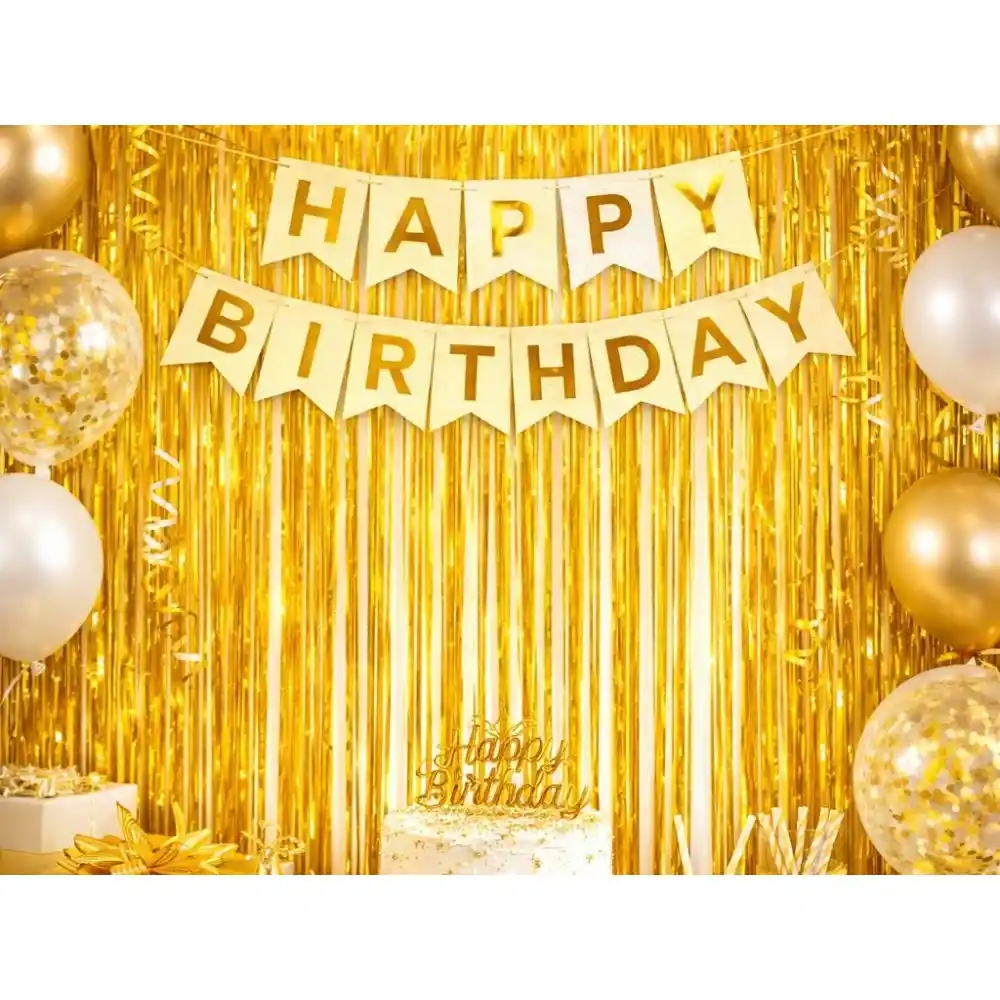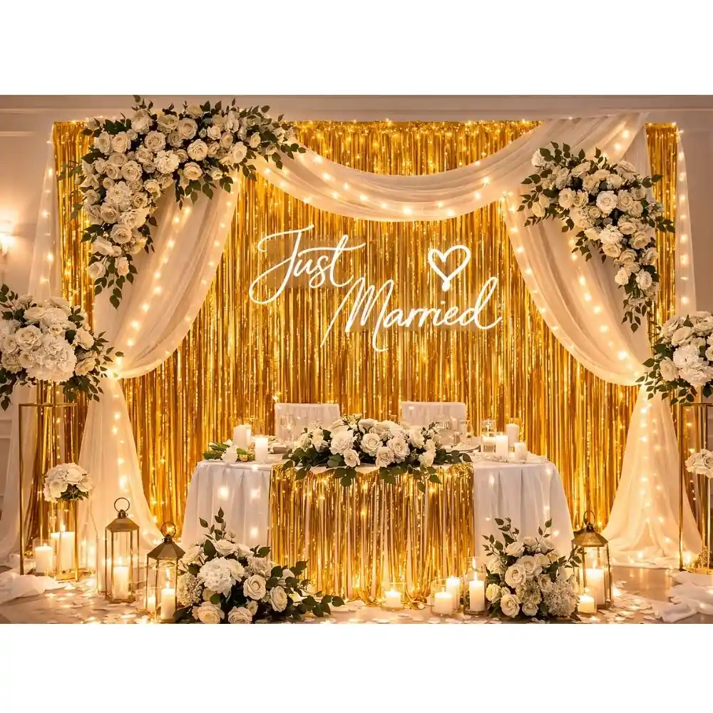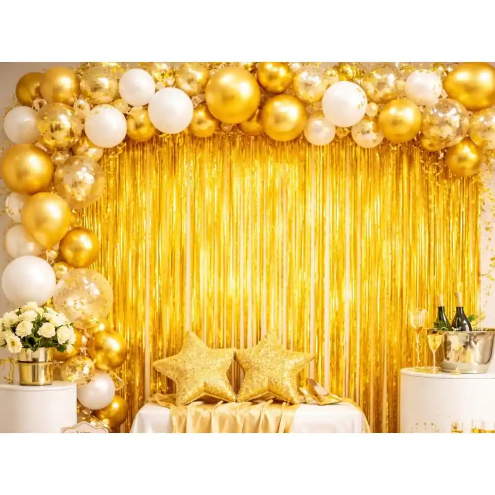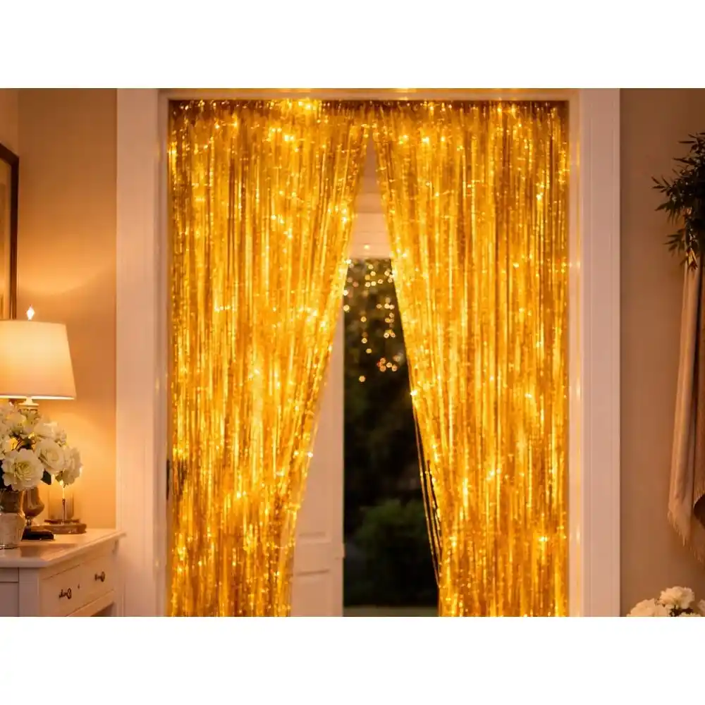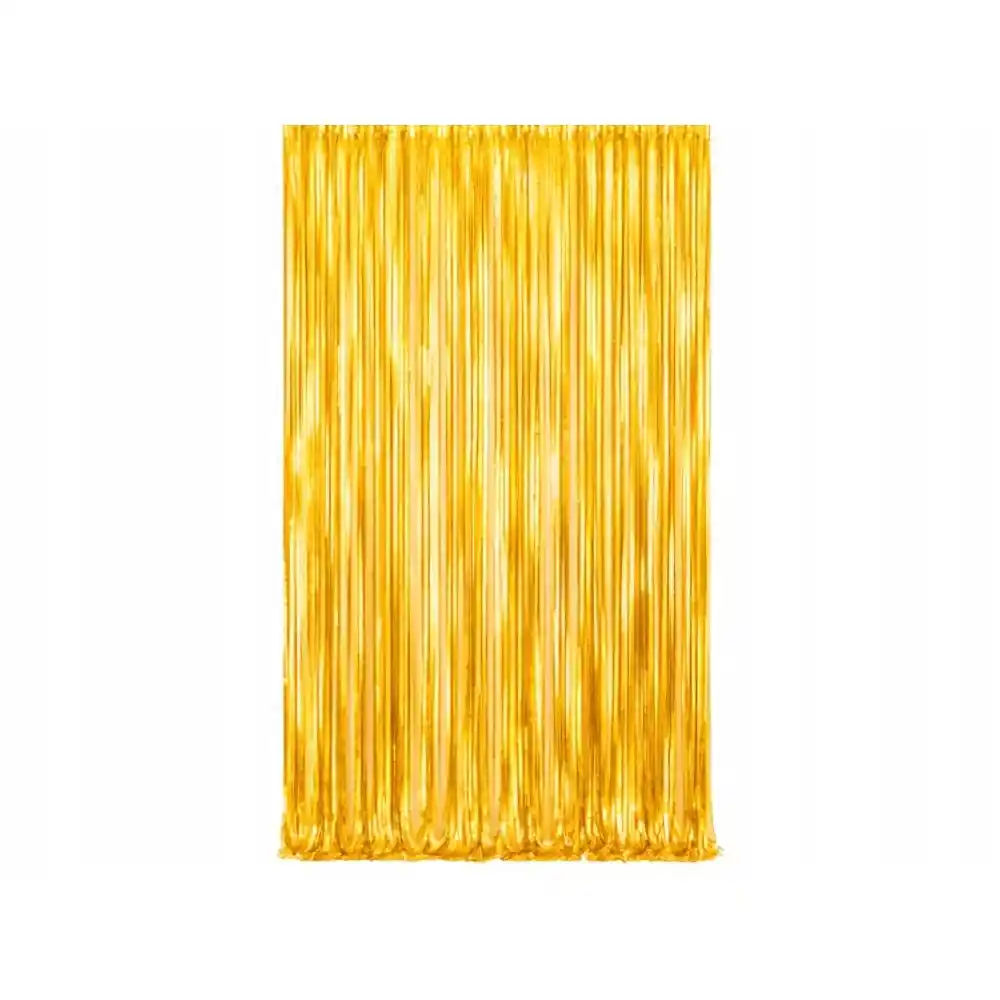 Denna guldfärgade foliegardin är en enkel och effektfull dekoration som skapar en festlig och lyxig känsla på några sekunder. Perfekt som bakgrund till fotografering, dekoration bakom festbordet eller som entré till ett rum.